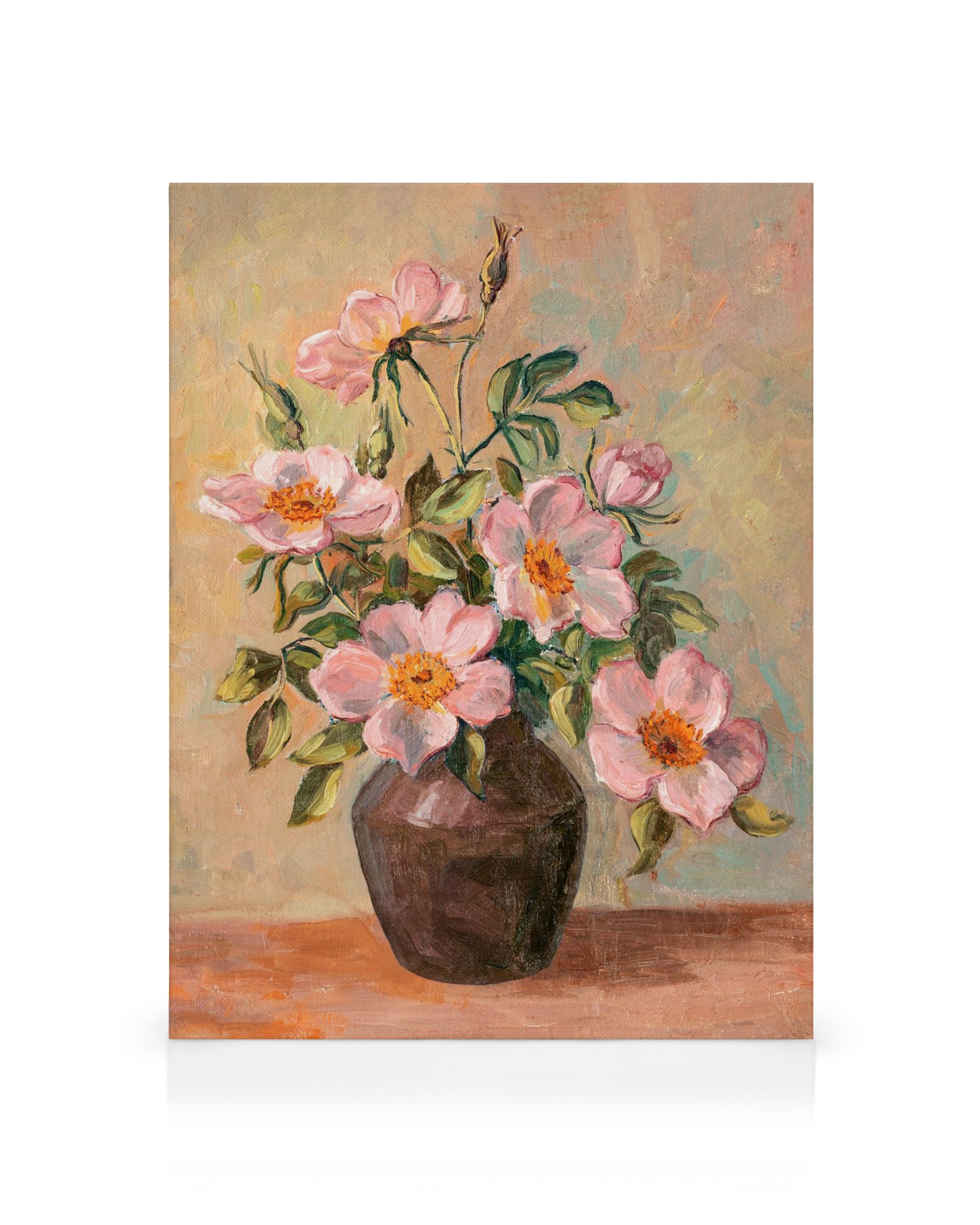 Obraz na płótnie przedstawiający malowane różowe kwiaty w brązowym wazonie na jasnobeżowym tle, z zielonymi liśćmi. Idealna dekoracja ścienna do Twojego salonu.