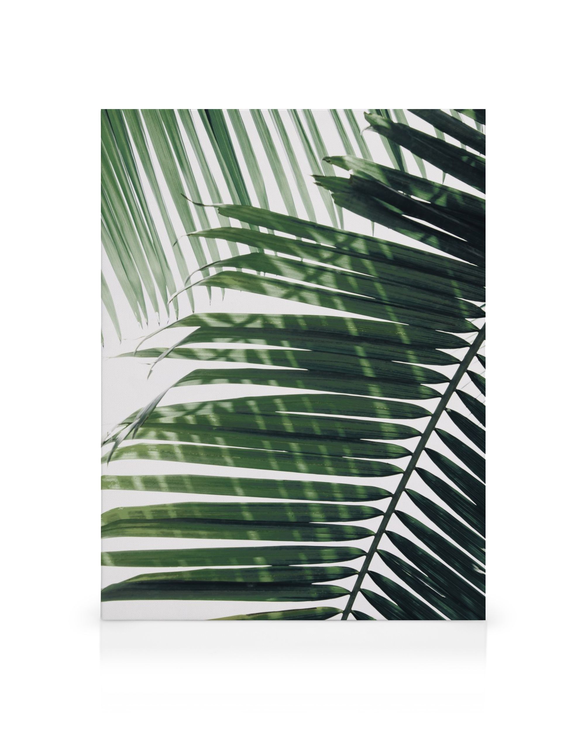 Od 99,95 złObraz na płótnie przedstawiający nakładające się zielone liście palmowe na białym tle. Liście są długie i wąskie z równoległymi żyłkami i ciemnozielonymi cieniami w paski.