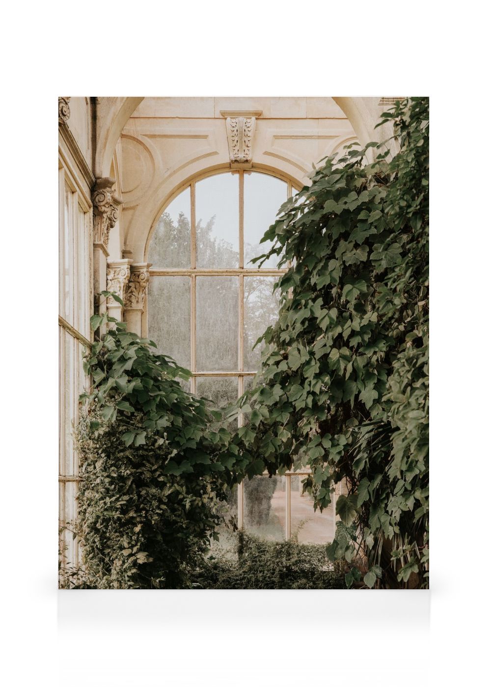 Piękny obraz na płótnie przedstawiający kamienne okno w łuku, częściowo pokryte zielonym bluszczem. Idealna dekoracja ścienna, aby stworzyć oszałamiającą galerię obrazów w Twoim domu.