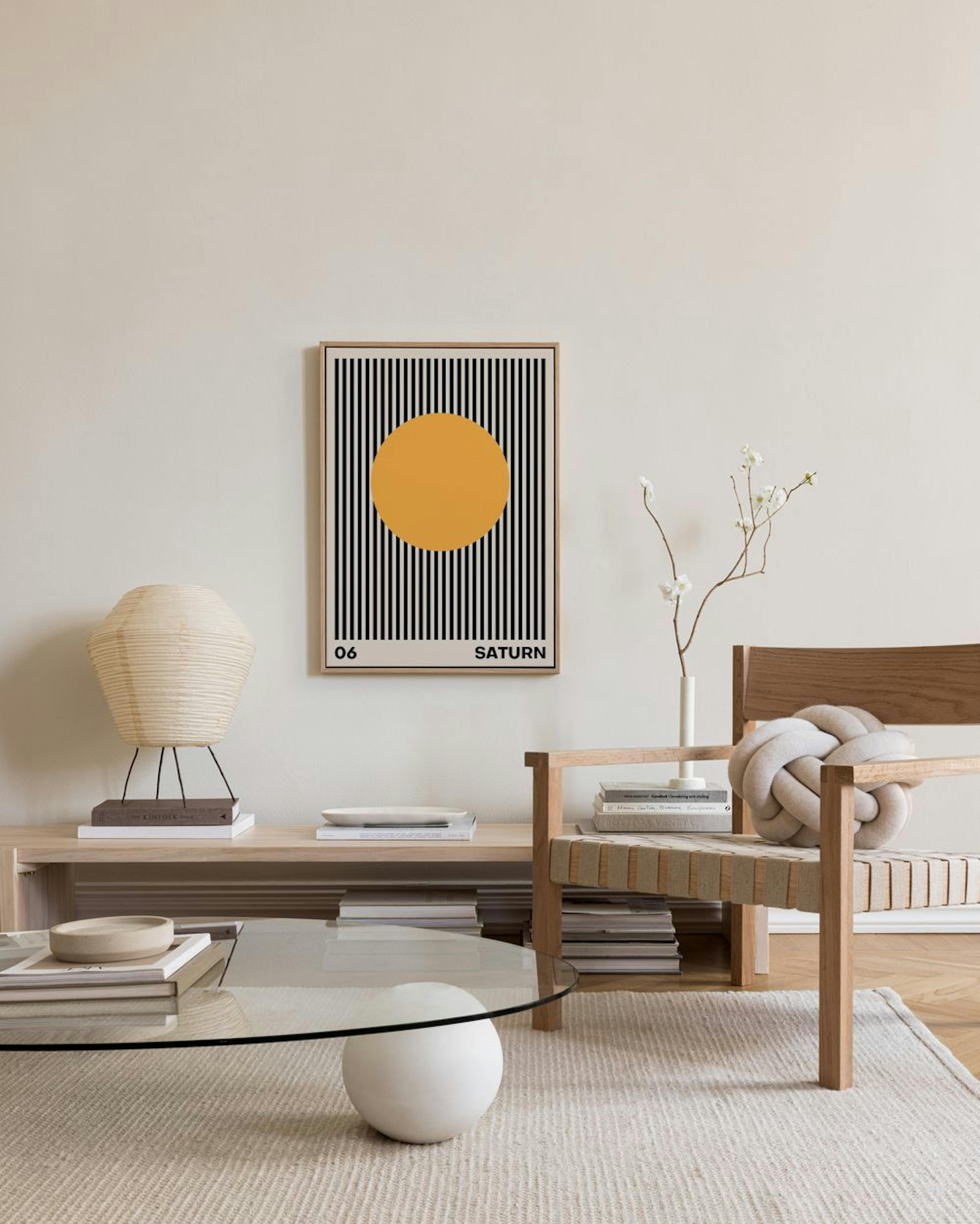 Obraz na płótnie przedstawiający duże pomarańczowe koło na tle czarno-białych pasków, z napisem "Saturn" i liczbą "06" poniżej. Przyciągająca wzrok dekoracja ścienna do Twojego domu.