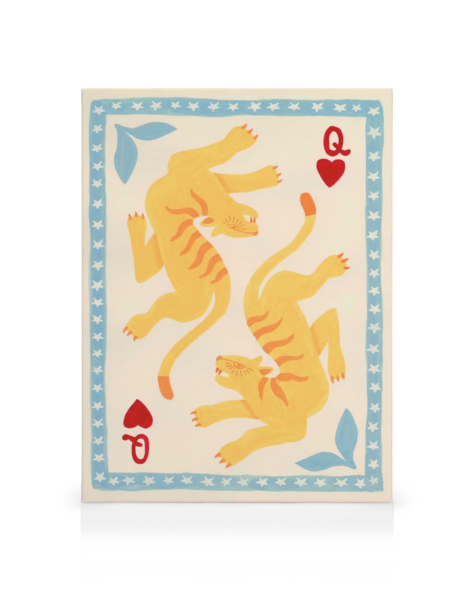 Od 37,77 złUderzający obraz na płótnie przedstawiający dwa pomarańczowe tygrysy na kremowym tle, ozdobiony czerwonymi symbolami kart do gry i niebieską gwiezdną ramką. Idealna sztuka ścienna do eklektycznej galerii obrazów.
