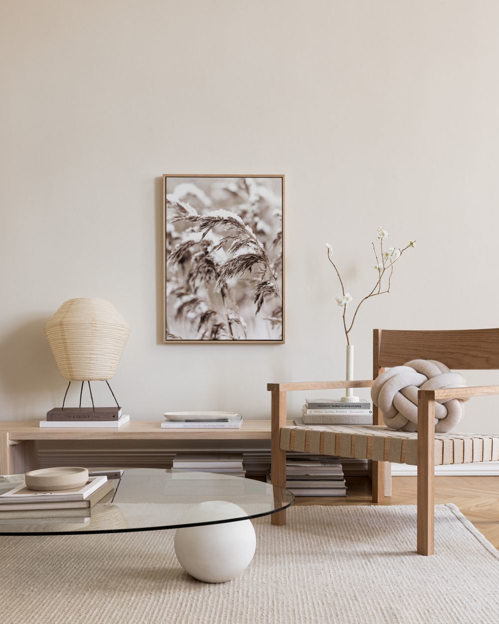 Fotografia wysokiej trawy pokrytej śniegiem. Brązowe i białe kolory tworzą zimny, zimowy klimat.