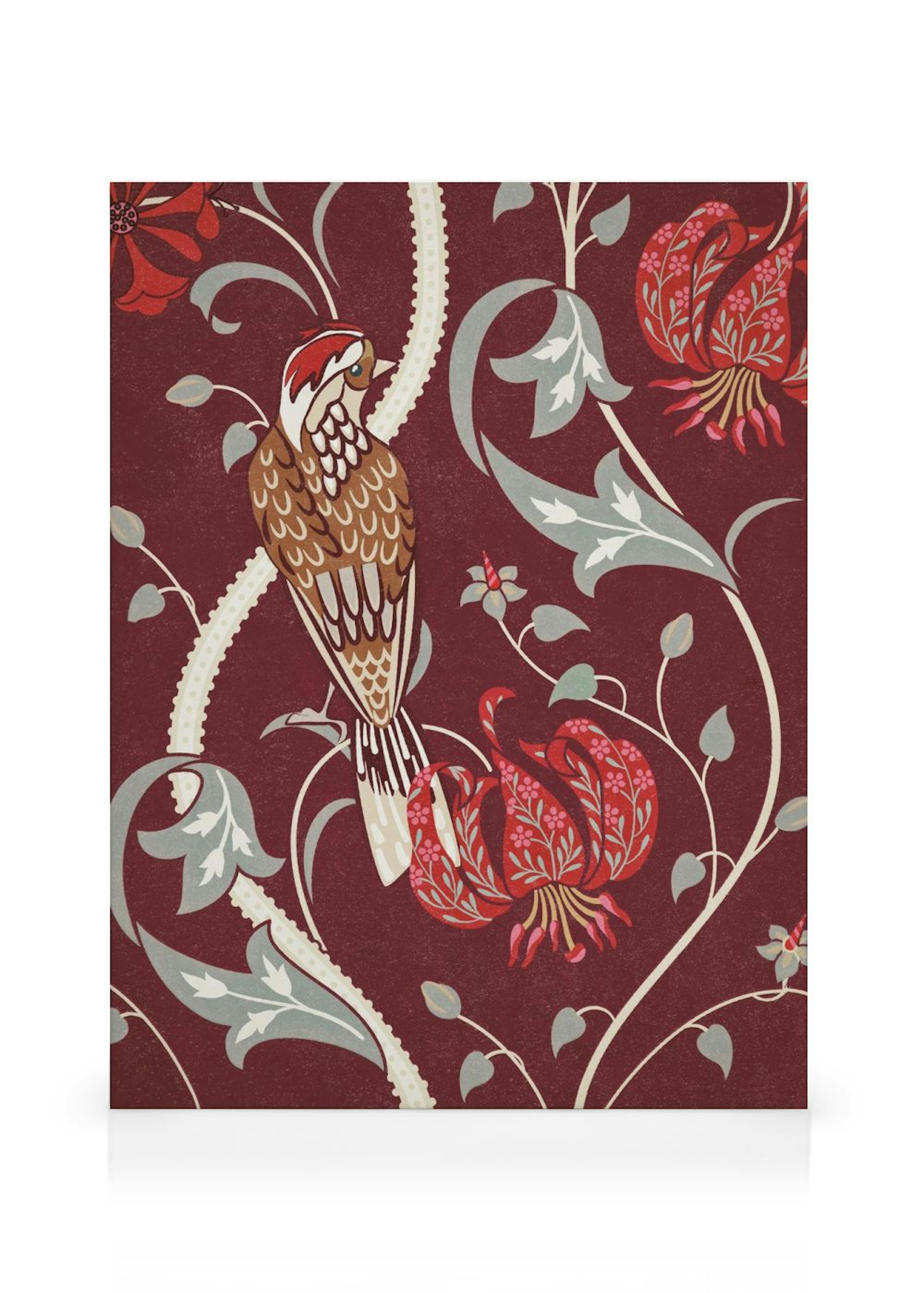 Oszałamiający obraz na płótnie przedstawiający dzięcioła siedzącego na białej gałęzi, na tle uderzającego czerwonego wzoru kwiatowego. Idealna dekoracja ścienna, dodająca artystycznego akcentu do Twojego wystroju.