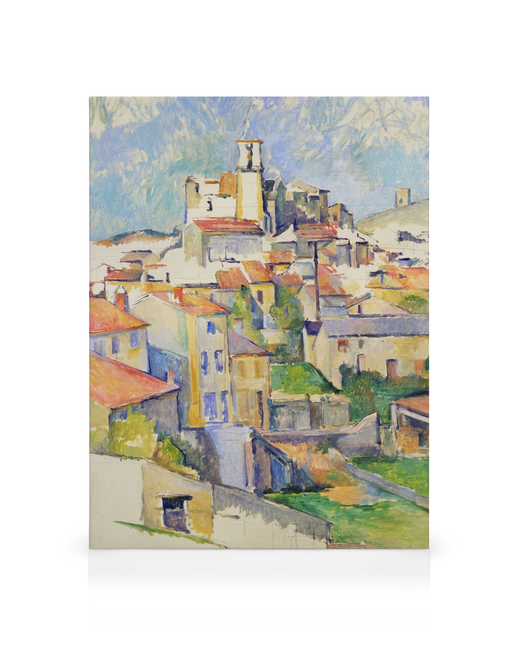 Od 35,07 złObraz na płótnie przedstawiający budynki z pomarańczowymi dachami na tle jasnoniebieskiego nieba z białymi chmurami. Kolorowa scena stworzona krótkimi pociągnięciami pędzla, światło słoneczne oświetla budynki.