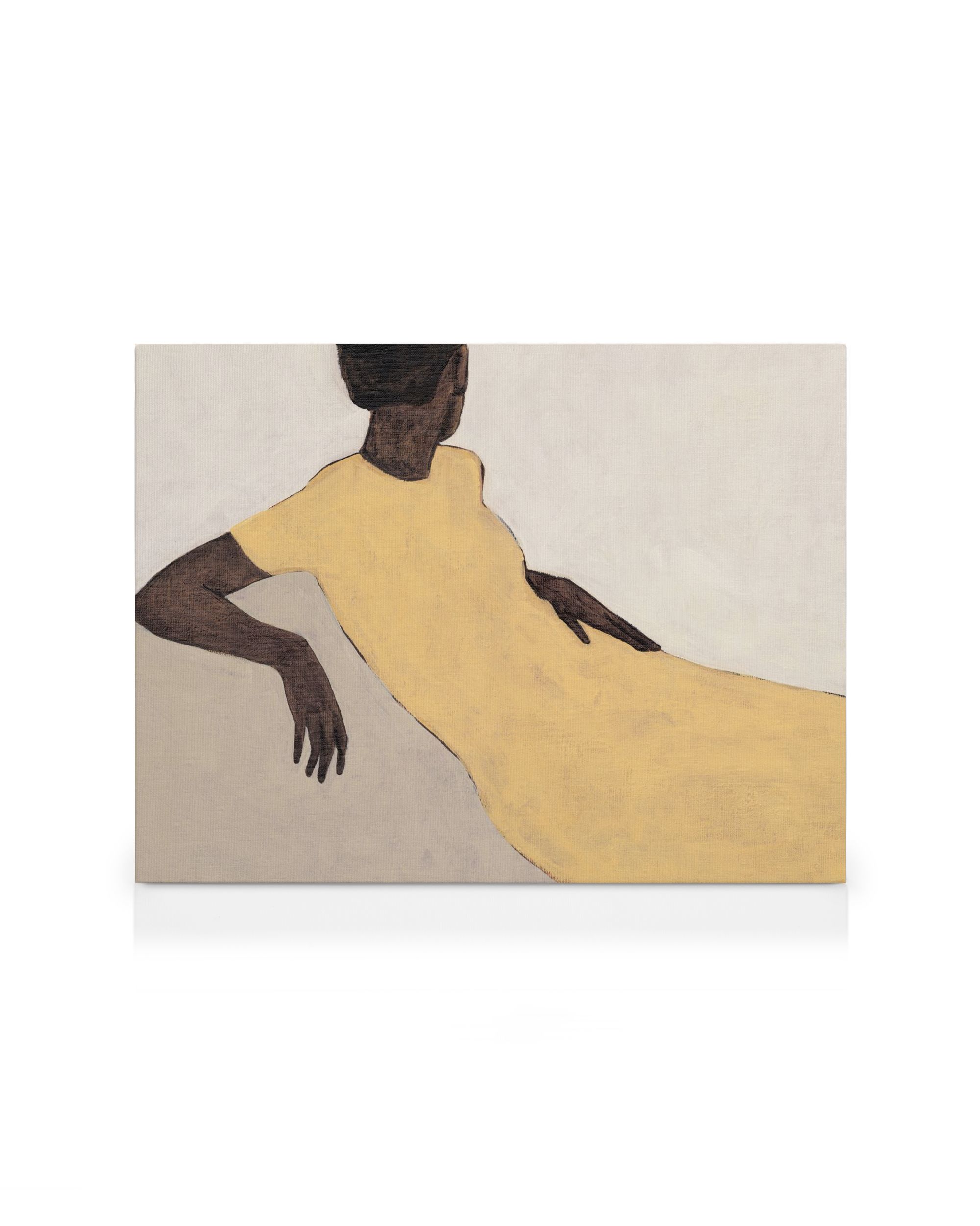 Obraz na płótnie przedstawiający kobietę w żółtej sukience na jasnym tle. Prosta i elegancka dekoracja, która ozdobi każdą ścianę.