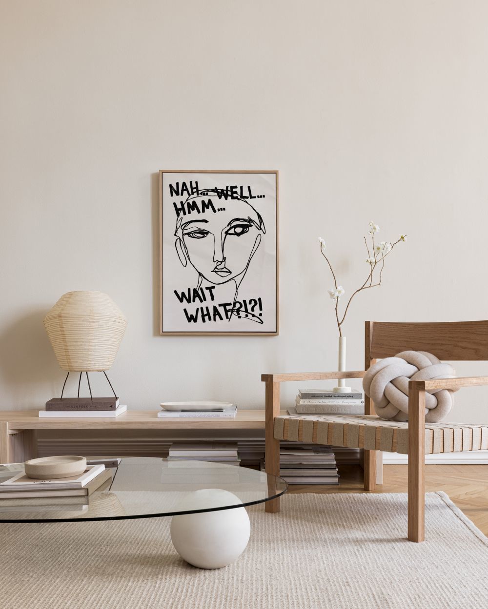 Rysunek liniowy na obrazie na płótnie przedstawiający twarz, z tekstem "Nah Well... Hmm... Wait What?!?". Czarnymi liniami naszkicowany portret na beżowym tle - idealna dekoracja ścienna do Twojego domu.