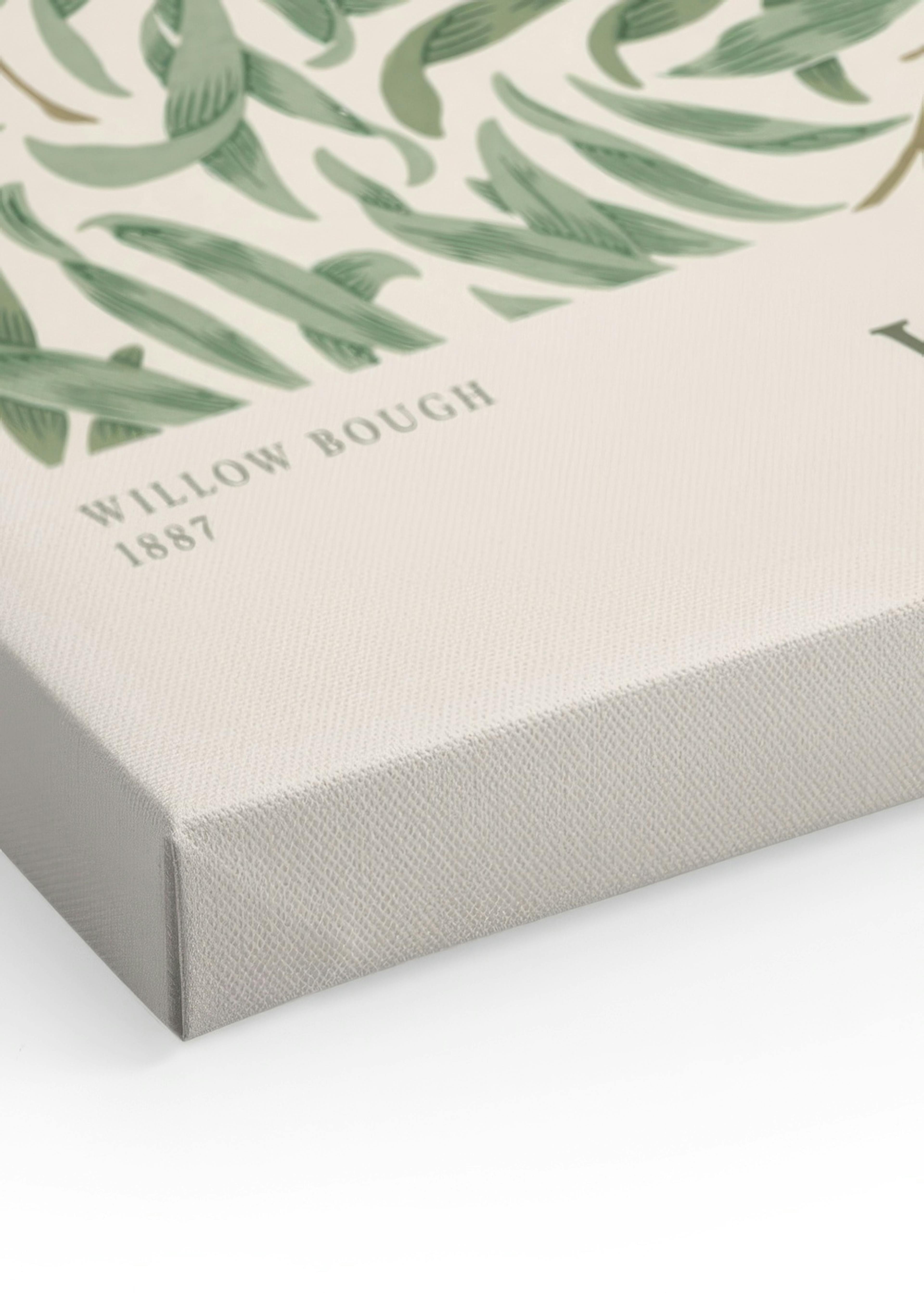 Piękny obraz na płótnie przedstawiający klasyczny wzór Williama Morrisa z zielonymi liśćmi wierzby na jasnym tle. Ten obraz na płótnie jest idealnym sposobem na udekorowanie domu eleganckim, botanicznym stylem.