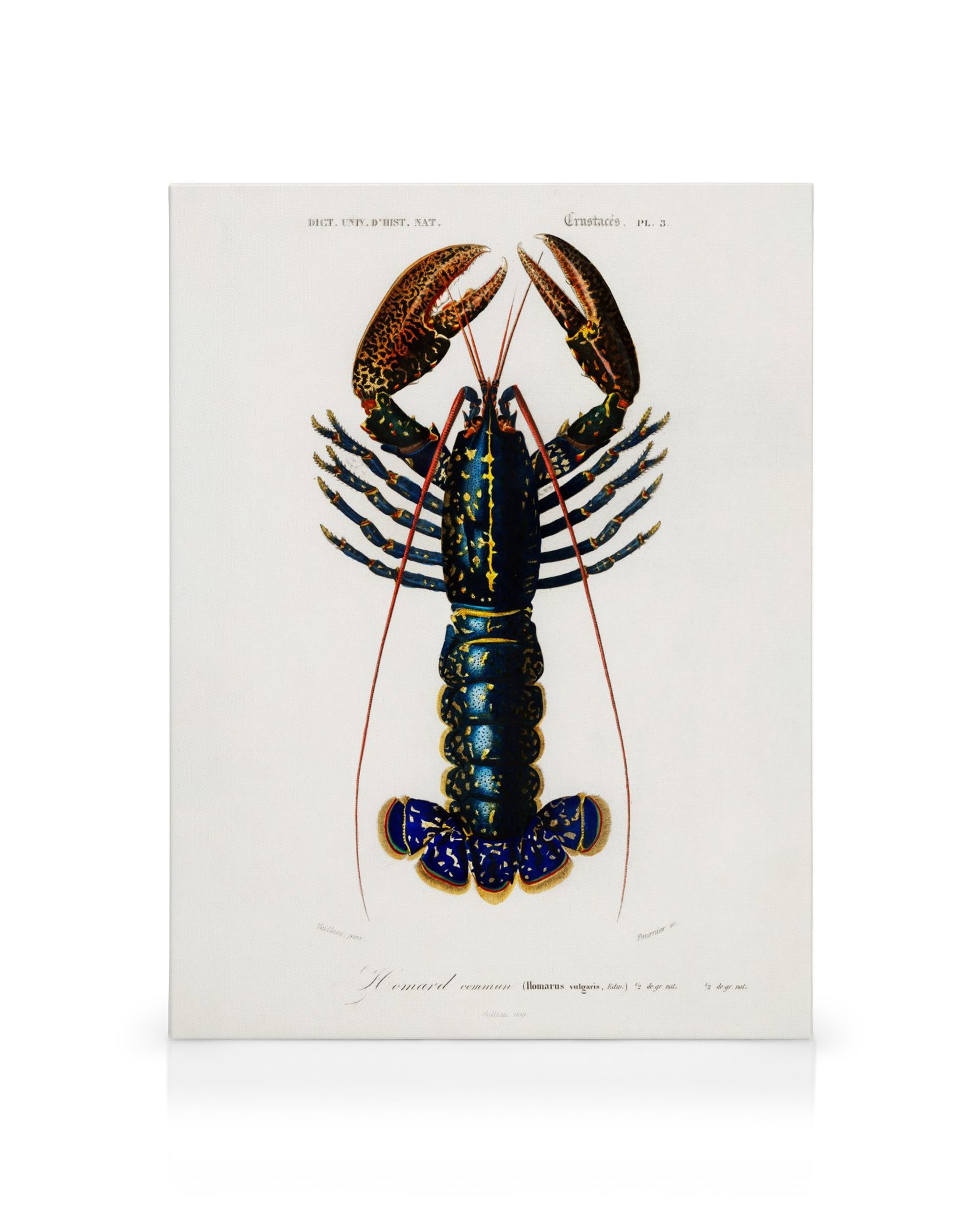 Szczegółowa ilustracja niebieskiego homara z żółtymi plamkami i dużymi pomarańczowymi szczypcami na białym tle. Idealny obraz na płótnie do Twojej kuchni lub jadalni.