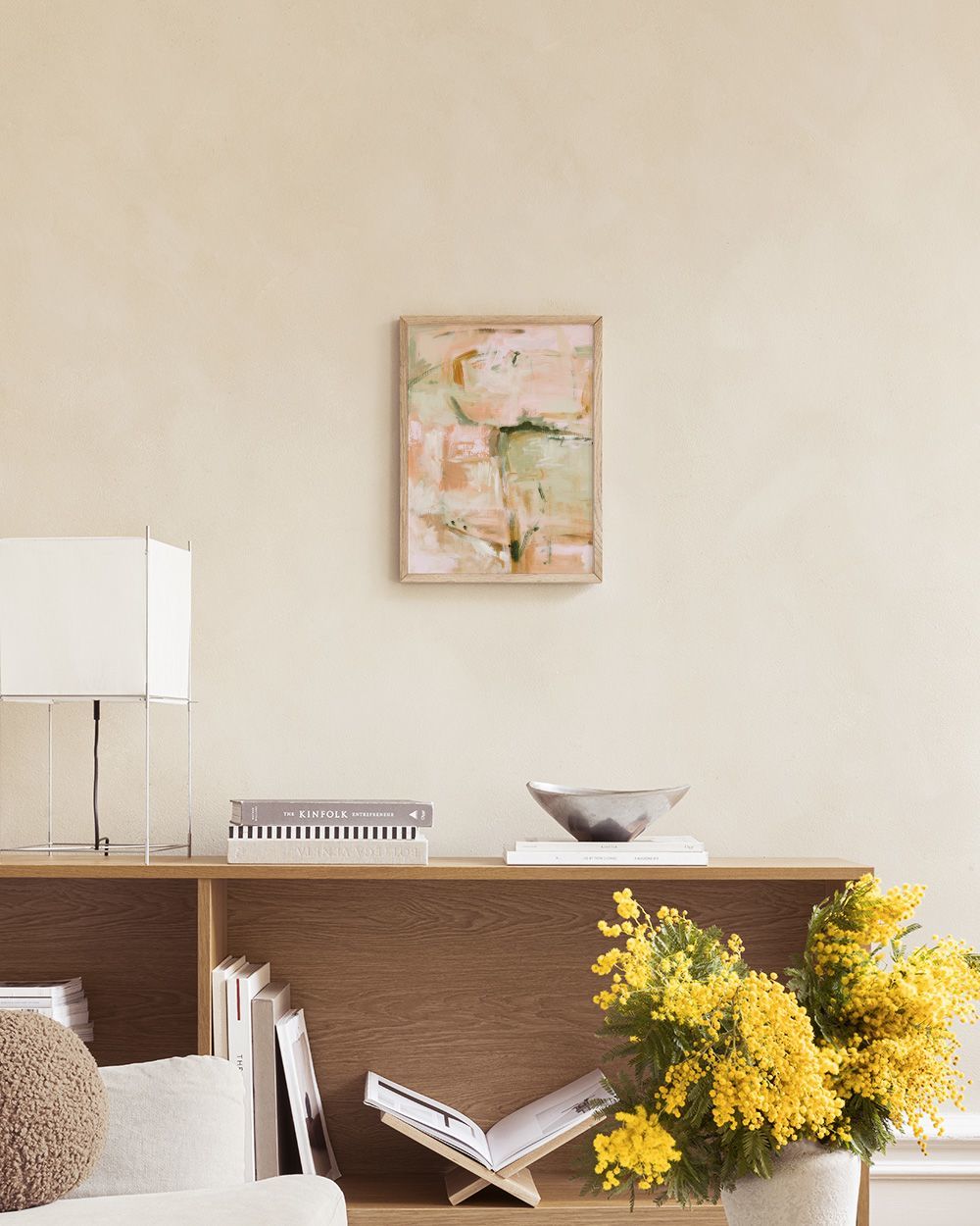 Od 97 złAbstrakcyjny plakat z delikatnymi pociągnięciami pędzla w jasnoróżowych, brzoskwiniowych i beżowych kolorach. Ta ręcznie malowana grafika ma spokojny i organiczny wygląd.