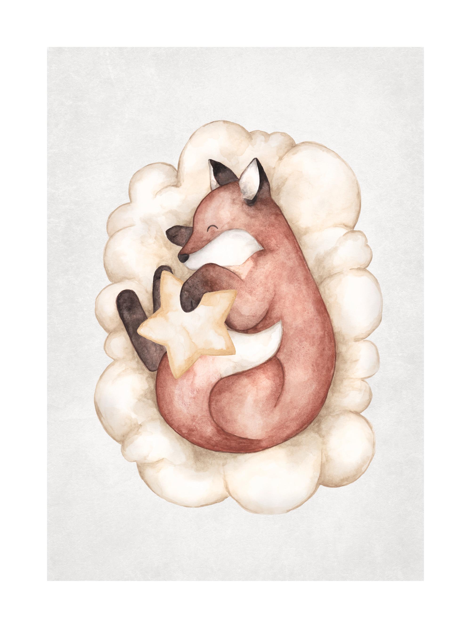 Od 37,77 złAkwarelowy druk przedstawiający liska śpiącego na chmurce, przytulonego do gwiazdki. Zawieś go w pokoju dla najmłodszych.
