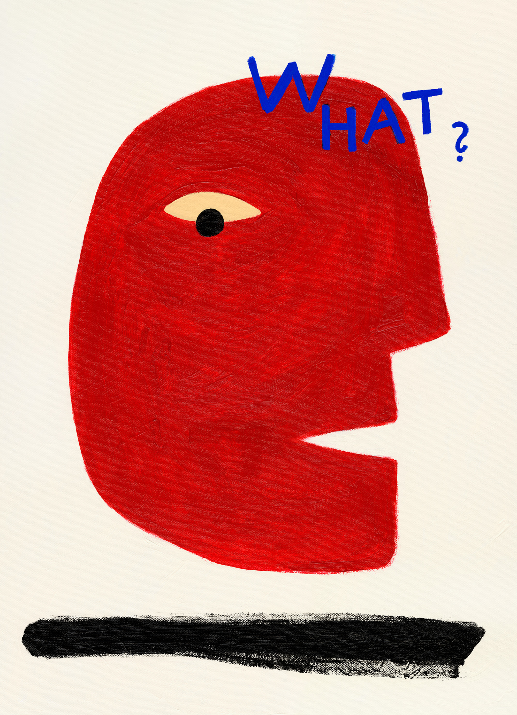 Odważny i abstrakcyjny plakat przedstawiający czerwoną twarz z napisem "WHAT?" w kolorze niebieskim powyżej. Idealny plakat, który doda zabawny akcent do Twojego domu.