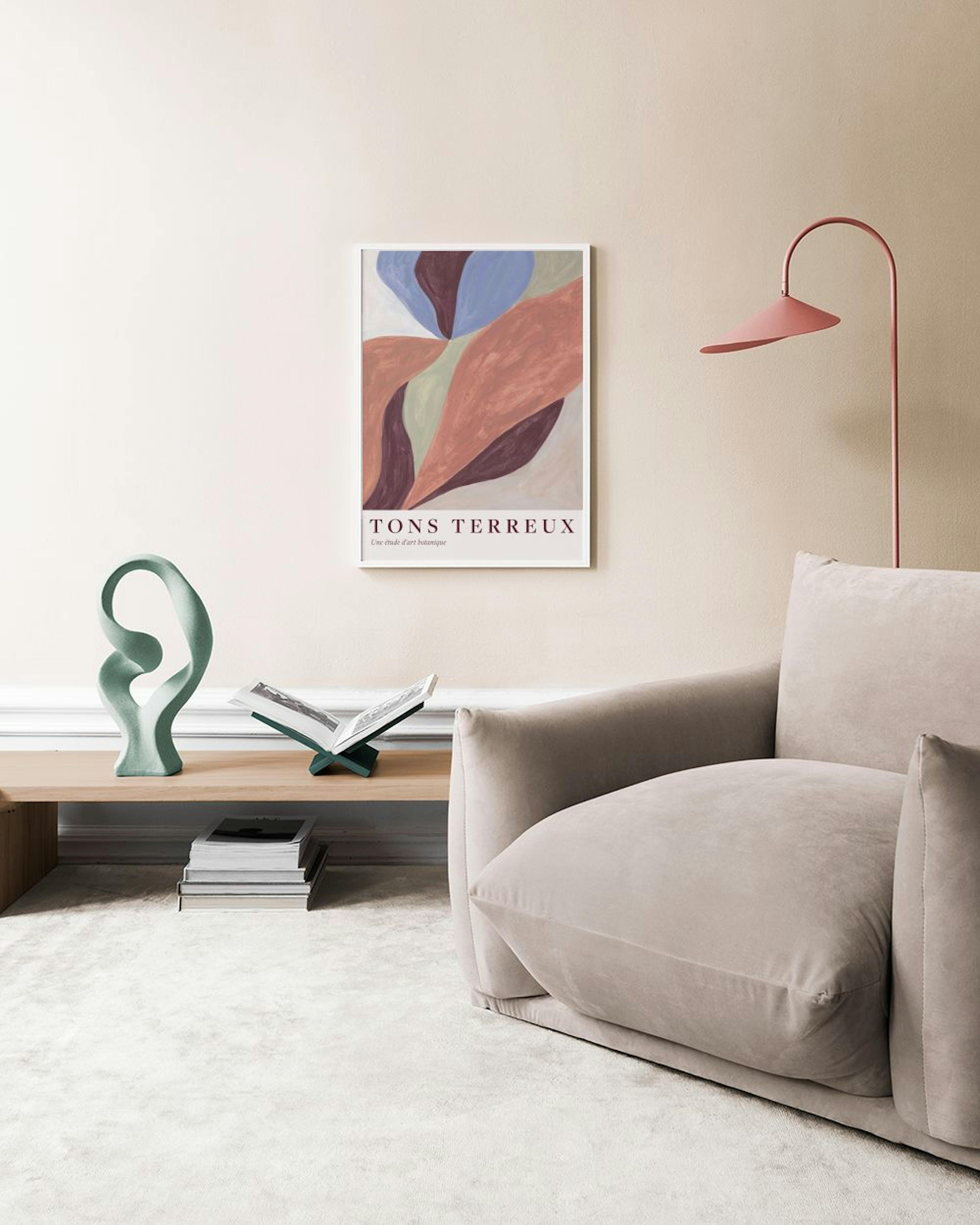 Abstrakcyjne plakaty ścienne z gładkimi kształtami w kolorach niebieskim, brązowym i zielonym. Plakat "Tons Terreux" ma miękkie, mieszane tekstury na jasnobeżowym tle, przypominającym sztukę botaniczną.