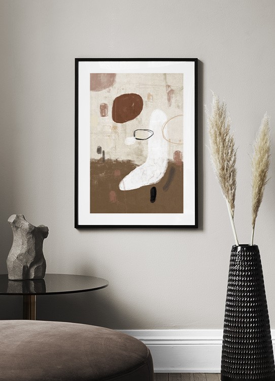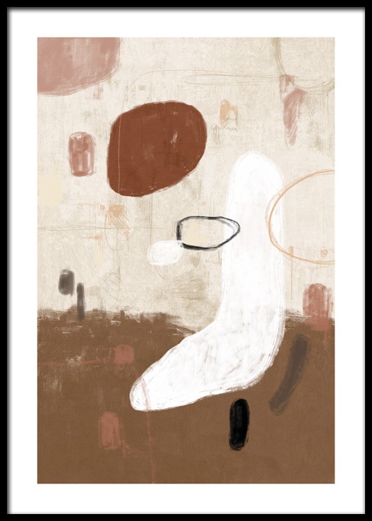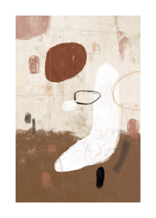 Wyselekcjonowany wzór Obraz z brązowymi, białymi i różowymi abstrakcyjnymi kształtami na beżowym tle. Ta nowoczesna, piękna praca będzie się świetnie prezentować w salonie, szczególnie jeśli zawiśnie obok obrazu Art Shapes No1.