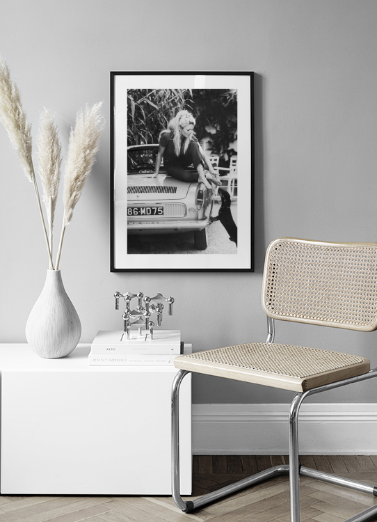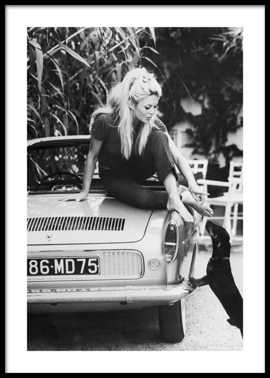 Od 31,95 złCzarno-białe zdjęcie Brigitte Bardot na samochodzie wyciągającej się w kierunku psa