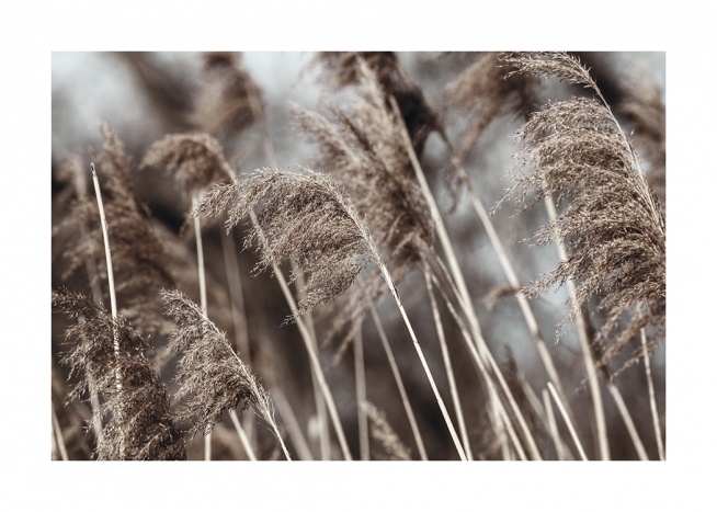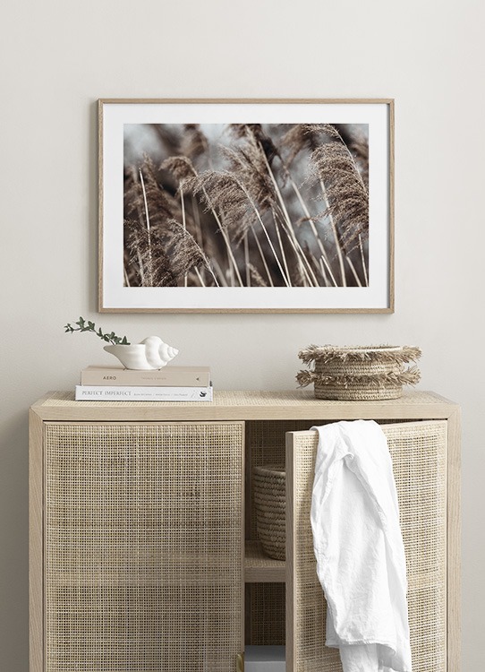 Wyselekcjonowany wzór Zdjęcie z beżową, suszoną trawą na rozmytym tle. Trend z zasuszoną trawą na pewno szybko nie zniknie. Jeśli masz nieco zasuszonej trawy w wazonie na stoliku kawowym, możesz ją skomponować z pasującymi plakatami.
