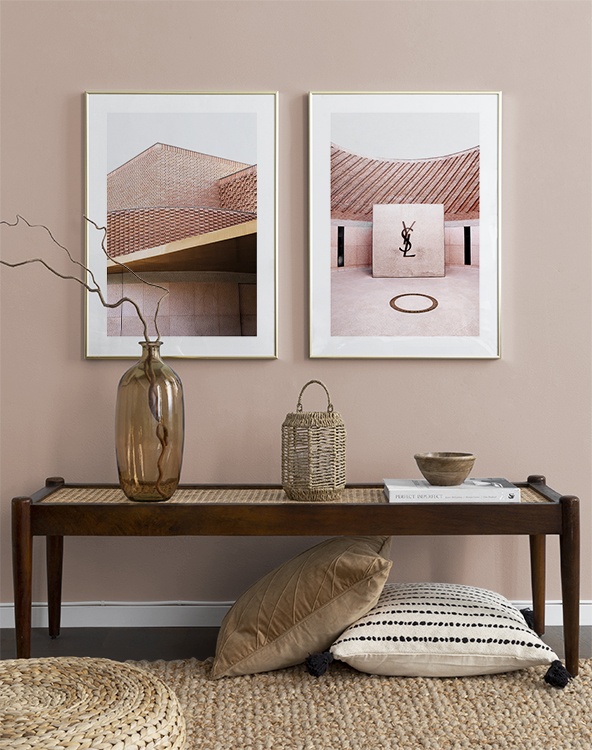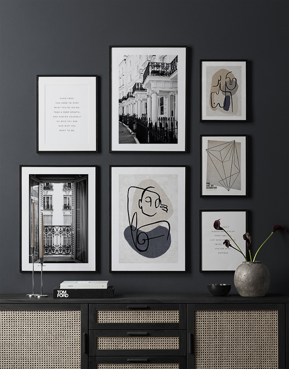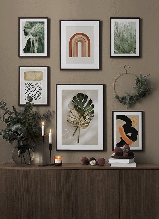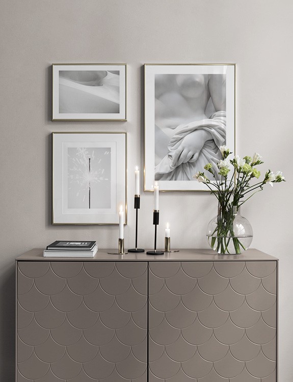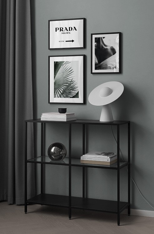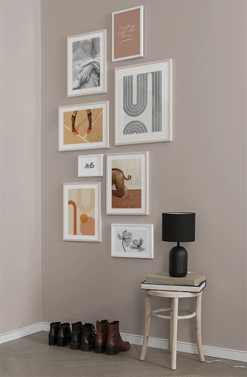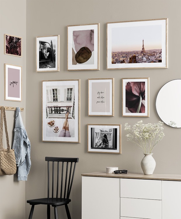Co powiesz na umieszczenie plakatów na meblach?. Jest to doskonały sposób, by uniknąć wiercenia otworów w ścianach! Postaw obrazy na półce lub na ławce umieszczonej przy ścianie, a wokół nich stwórz wyjątkową dekorację przykuwającą uwagę. W ten sposób łatwo możesz zmieniać wystrój przedpokoju i dostosować go do swego gustu i pór roku! Jeżeli wolisz powiesić obrazy, dobrą opcją jest stworzenie nowoczesnej galerii, która pasuje zarówno do małych jak i dużych pomieszczeń.