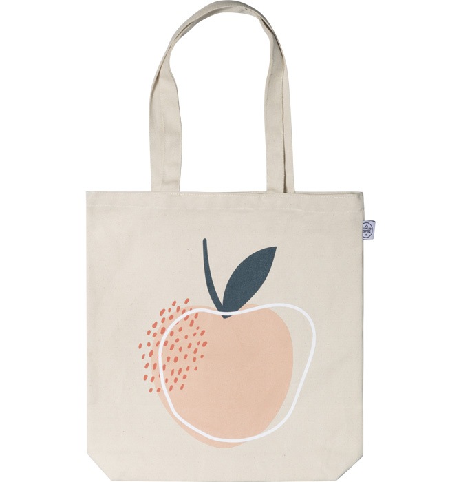 – Beżowa torba bawełniana z nadrukiem z przodu z ilustracją przedstawiającą brzoskwinię z różowymi kropkami i białym okręgiem