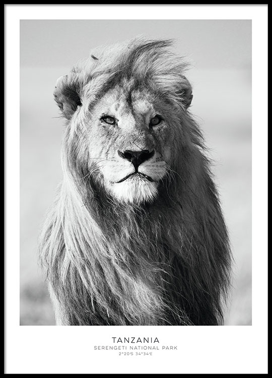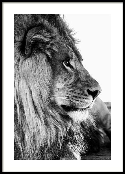 Svartvit poster med foto av lejon. Passar bra i en tavelvägg.