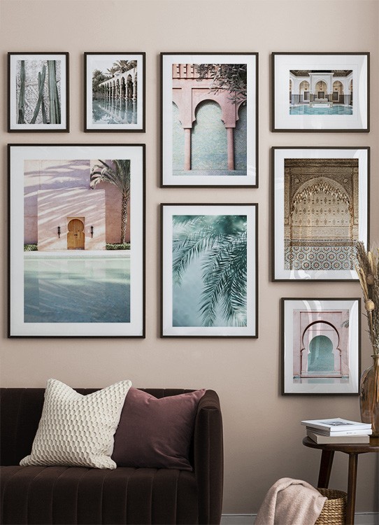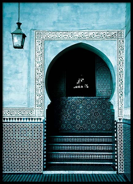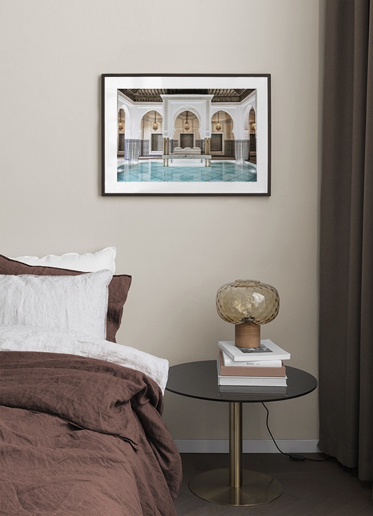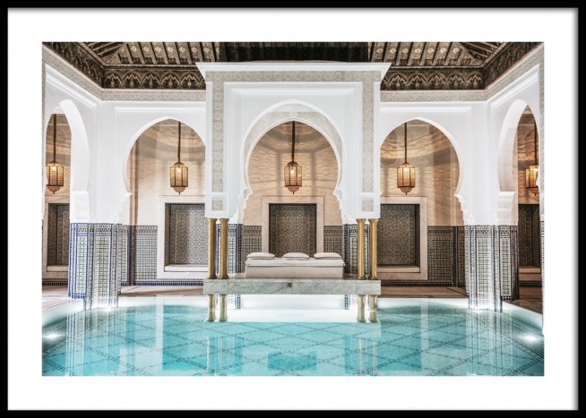 Wyselekcjonowany wzór Zdjęcie basenu w pomieszczeniu ze złotymi lampami, niebieskimi kolumnami i białymi, wielolistnymi łukami. To tajemnicze miejsce łączy w sobie zarówno wielką tradycję, jak i artyzm, co sprawia, że za każdym razem nas urzeka. Ten plakat jest częścią Studio Amara, kolekcji zdjęć wykonanych przez Desenio Design Studio w Marrakeszu.