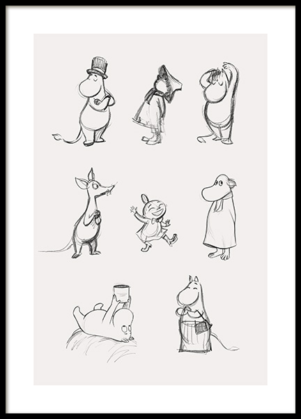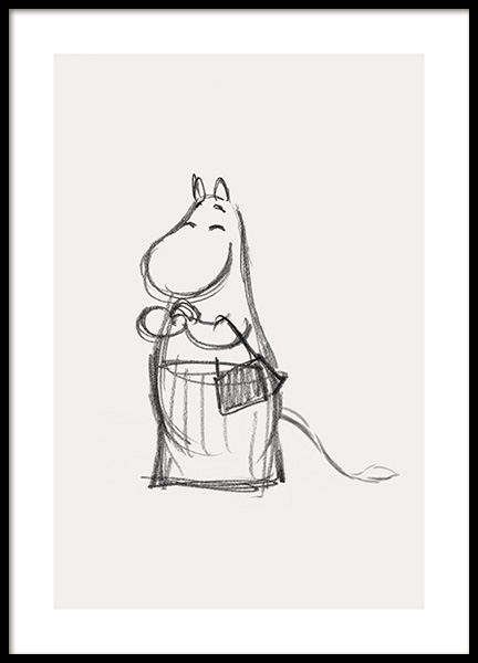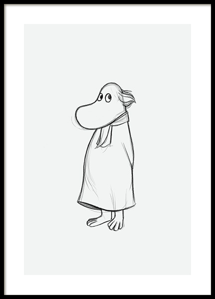 Plakaty te przedstawiają wszystkie nasze ulubione postacie zamieszkujące Dolinę Muminków. Znajdź swój ulubiony plakat Muminka, Mamy Muminka, Taty Muminka, Włóczykija, Migotki, Małej Mi, Ryjka lub Paszczaka. Jeżeli chcesz przerobić pokój dziecięcy, teraz masz ku temu idealną okazję! Wesołe i zabawne, a jednocześnie stylowe. Czy istnieje lepsze połączenie? Ręcznie rysowane detale nadają grafikom autentyczny wygląd, a pastelowe tła sprawiają, że tworzą galerię ścienną o wspaniałej kompozycji.