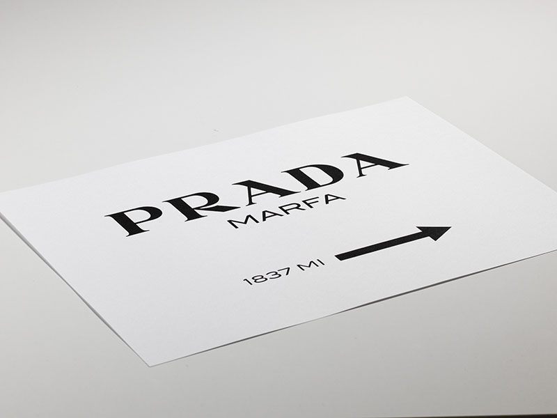 Wyselekcjonowany wzór Czarno-biały obraz z tekstem z logo Prada Marfa. Nowoczesna klasyka! Ten prosty, choć elegancki znak Prada Marfa dobrze pasowałby do innych naszych plakatów o tematyce modowej. Razem stworzą modną ścianę z obrazami. Idealny do pokoju nastolatki, która chce mu nadać swój własny charakter.