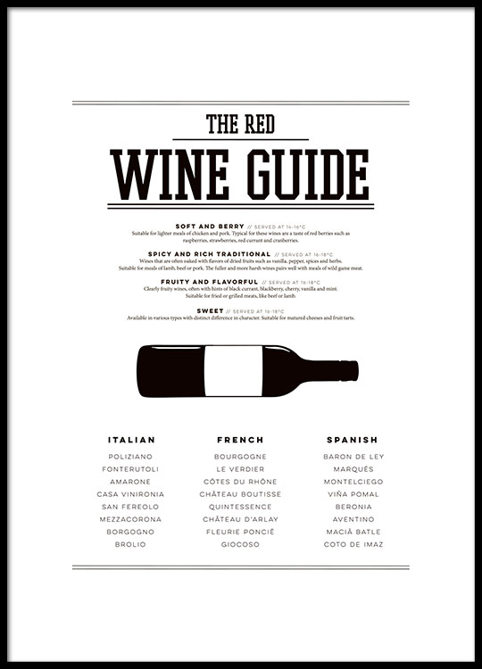 Wyselekcjonowany wzór Czarno-biały plakat z przewodnikiem po czerwonych winach. Doskonale pasująca do kuchni stylowa reprodukcja, która świetnie komponuje się z innymi naszymi plakatami o tematyce kulinarnej, na przykład tymi z rodzajami wołowiny i baraniny. Potrzebujesz pomysłu na dekorację ścian? Zobacz nasze pełne inspiracji pokazowe pokoje! Plakat wydrukowano na wysokiej jakości białym, niepowlekanym, matowym papierze.