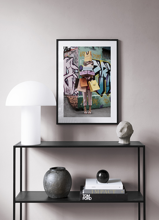 Zdjęcie kobiety trzymającej przed sobą torby i pudła z zakupami na tle ściany z graffiti. Projekt stanowi część "Studio Stadtkind", kolekcji zdjęć przygotowanej przez artystów z Desenio Design Studio. Modelką i muzą była niemiecka influencerka, Aylin König.