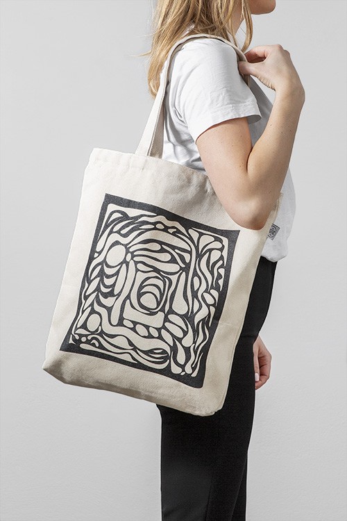 – Beżowa torba bawełniana z abstrakcyjną ilustracją w kolorze czarnym z nadrukiem z przodu