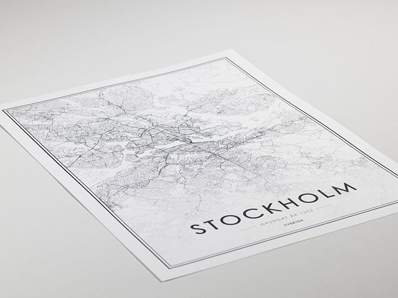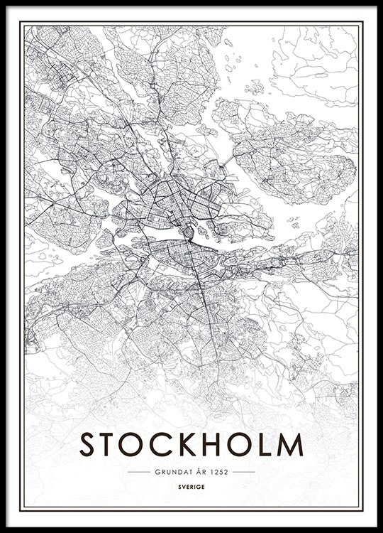 Poster / tavla med Stockholmskarta. Svartvit karta över Stockholm.