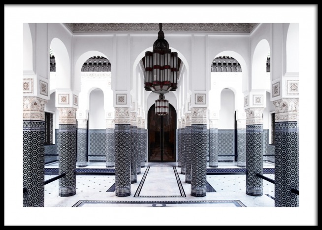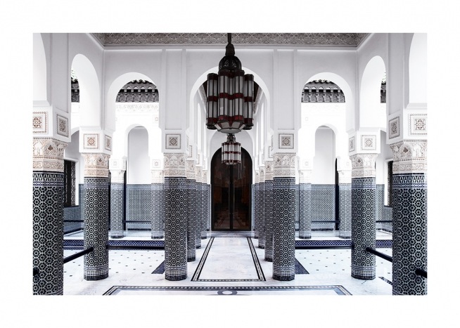 Wyselekcjonowany wzór Zdjęcie niebieskich i białych kolumn w sali z czarnymi drzwiami i żyrandolem na suficie. Jeśli uwielbiasz starożytną architekturę i tajemnicze zakątki, służymy pomocą! Ten plakat jest częścią Studio Amara, kolekcji zdjęć wykonanych przez Desenio Design Studio w Marrakeszu.