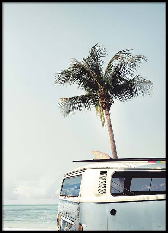 Wyselekcjonowany wzór Uroczy plakat retro z zaparkowaną przy plaży starą pastelowo niebieską furgonetką. Plakat ze zdjęciem palm i turkusową wodą, który sprawi, że zaczniesz marzyć o tym, by znaleźć się w tym rajskim miejscu. Będzie wyglądał bardzo stylowo z oprawą elegancko okalającą grafikę.